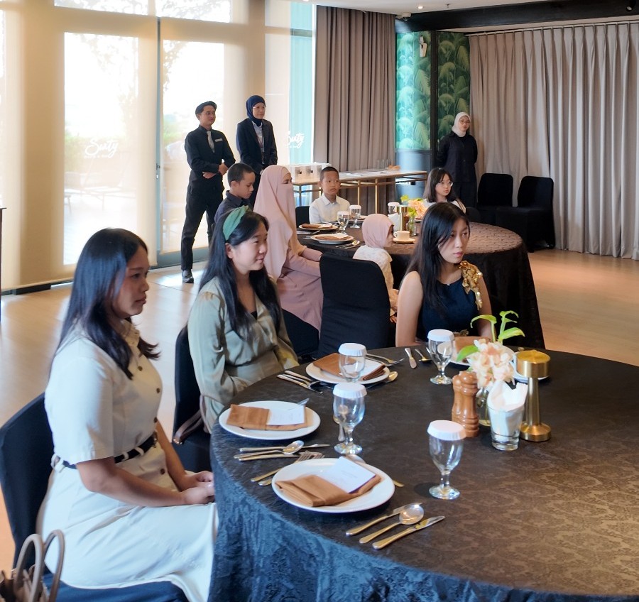 Para peserta terlihat antusias mengikuti setiap tahap pembelajaran. Suasana semakin hangat ketika sesi praktik berlangsung, di mana mereka berlatih menghadapi berbagai situasi, mulai dari menyantap appetizer hingga hidangan penutup, sambil menjaga etika komunikasi di meja makan.