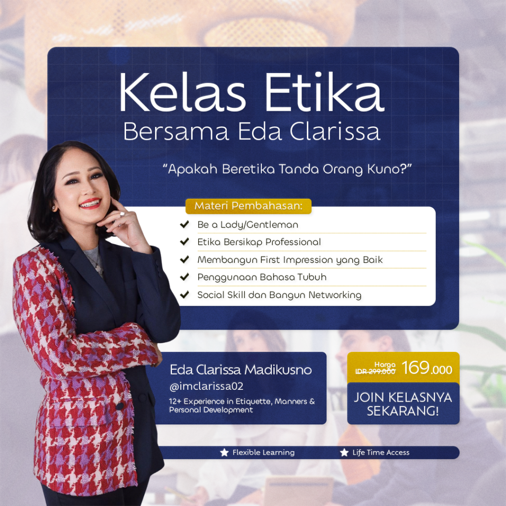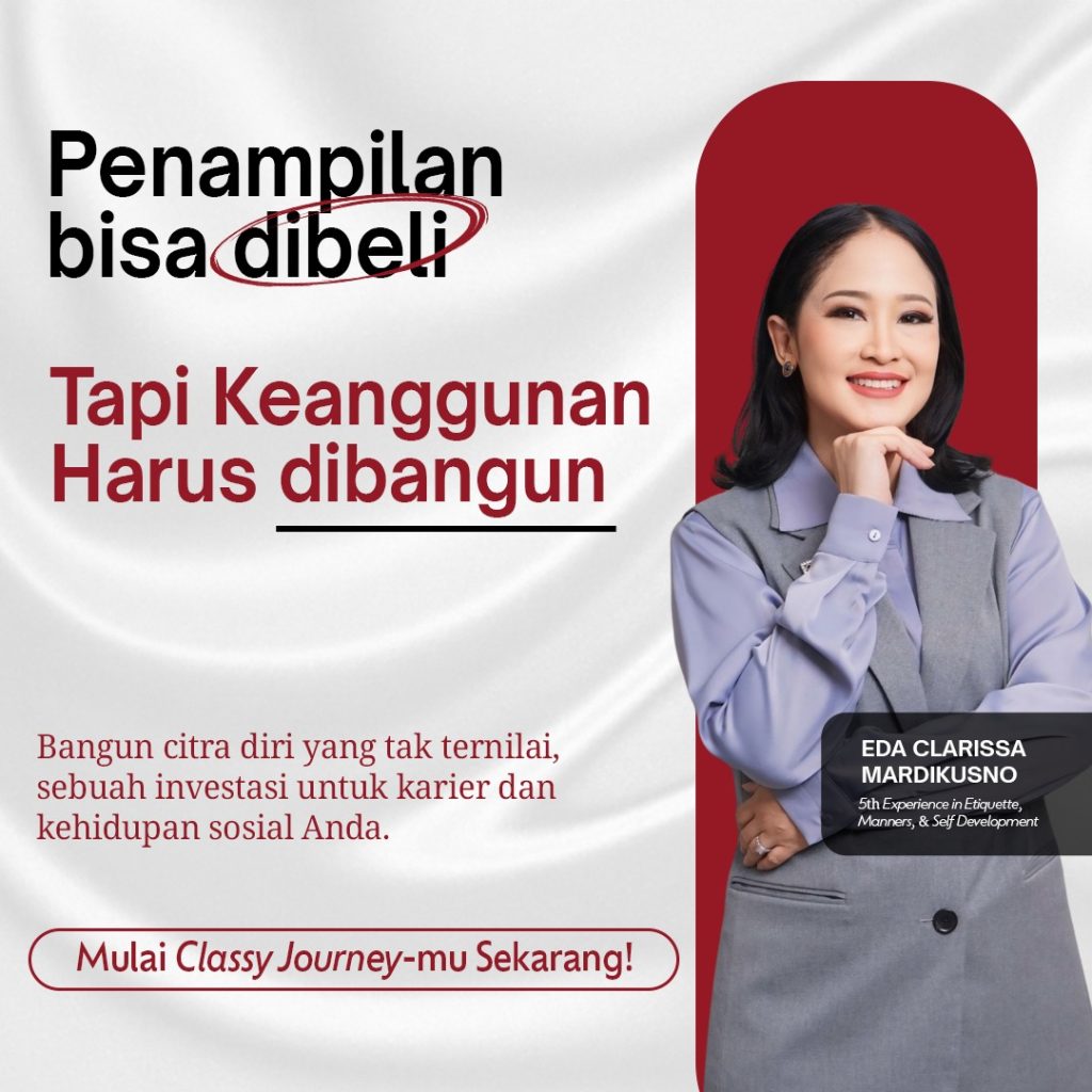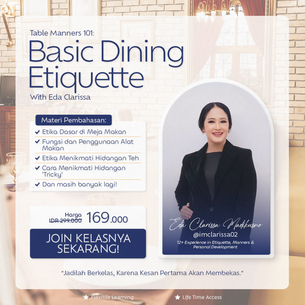 Classy Journey menghadirkan solusi yang tepat untukmu melalui Video Learning: Basic Etiquette & Table Manner. Dengan format pembelajaran yang bisa diakses kapan saja dan di mana saja, kamu akan lebih siap menghadapi berbagai situasi sosial maupun profesional.